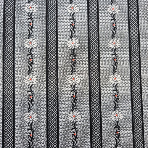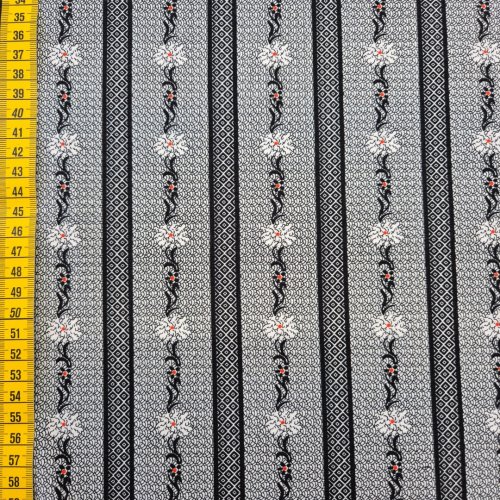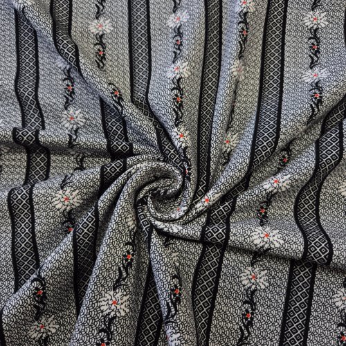Der Jersey Stoff "Edelweiss schwarz" bringt Tradition mit Stil auf den Punkt. Das edle Schwarz bildet einen wunderschönen Kontrast zu den feinen, weissen Edelweiss-Blüten – ein Design, das sowohl klassisch als auch modern wirkt. Egal ob für Shirts, Kleider, Röcke oder Hoodies – dieser Stoff ist vielseitig für Bekleidung einsetzbar und trägt sich dank seiner weichen, elastischen Qualität super angenehm auf der Haut.