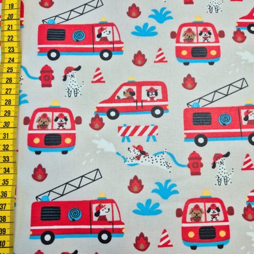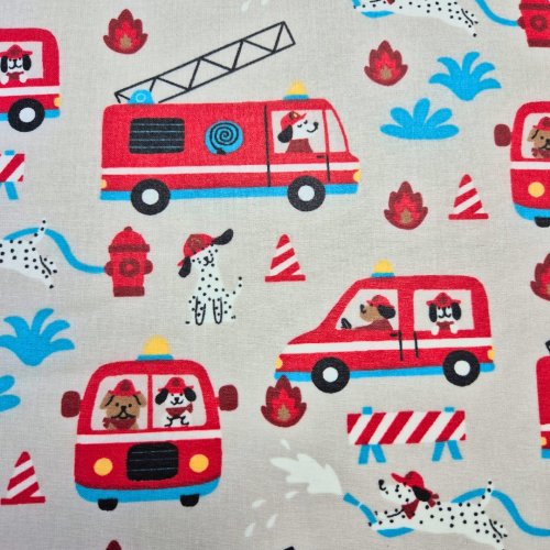 Ein beschichteter Stoff mit Feuerwehrautos auf grauem Hintergrund.